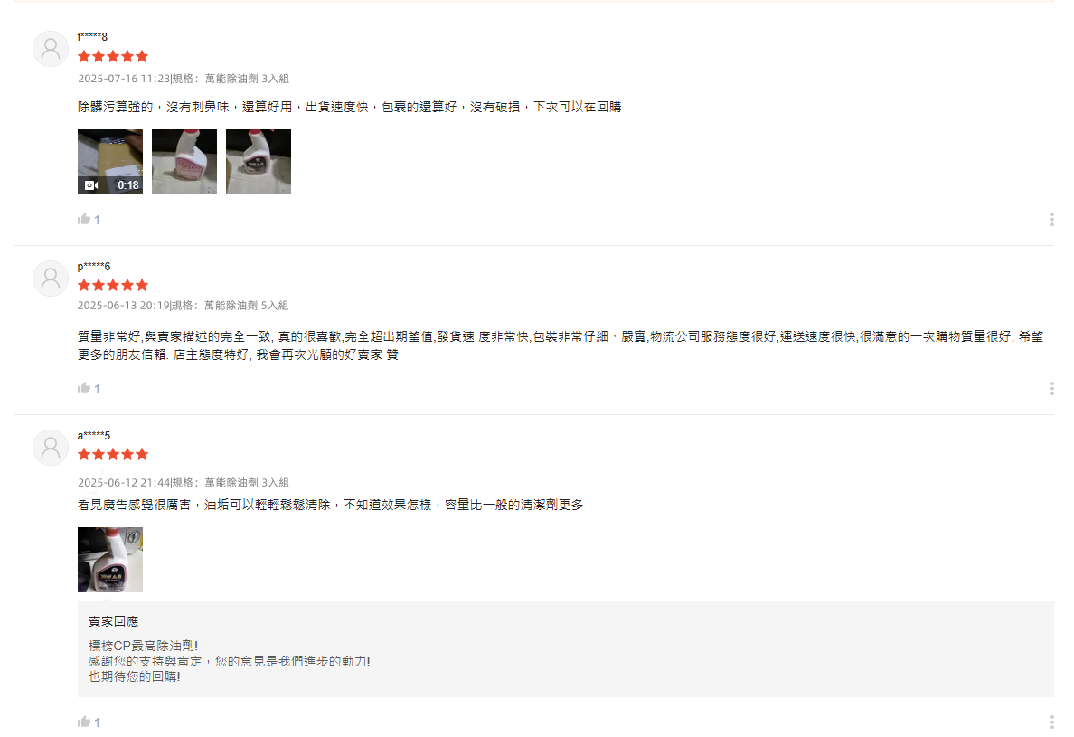 12分鐘前【夜市人生清潔劑】-(夜市人生水垢還原劑)適合各處殘留水垢,只清水垢,不傷手/不刺鼻,只要有水垢的地方通通清的起來!【夜市人生萬能除油劑】廚房救星!❗油污秒殺❗ 噴後10秒擦淨|網友狂推|頑固油漬剋星|輕鬆分解重油污 - 台灣製【夜市人生萬能除油劑】好用不傷手 買三送三 6組分享裝NT$1380(單瓶NT$230)