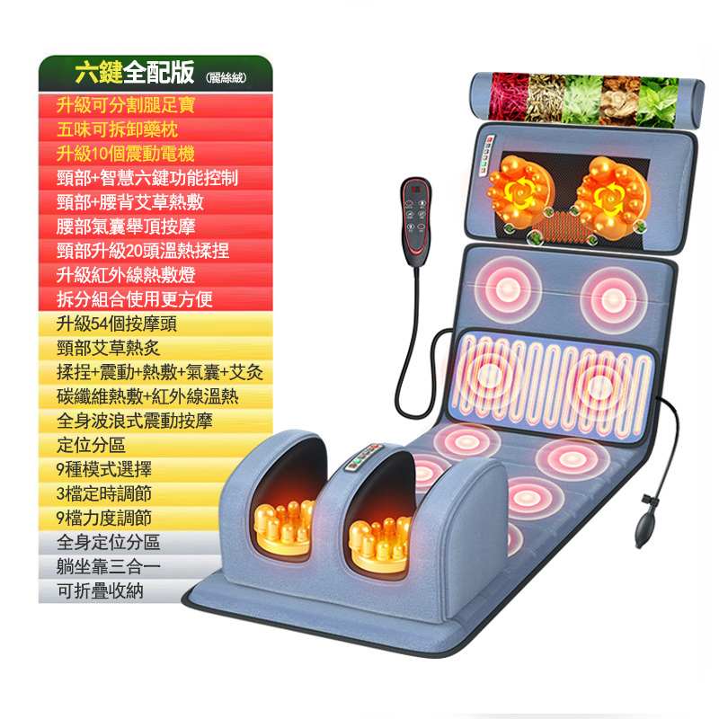 12分鐘前多功能全身按摩床墊 | 電動加熱頸椎、腰部、背部、腿部全方位按摩器,舒緩身心疲勞 - 6鍵旗艦款(6鍵揉捏+震動+氣囊+10電機+腰部熱敷)