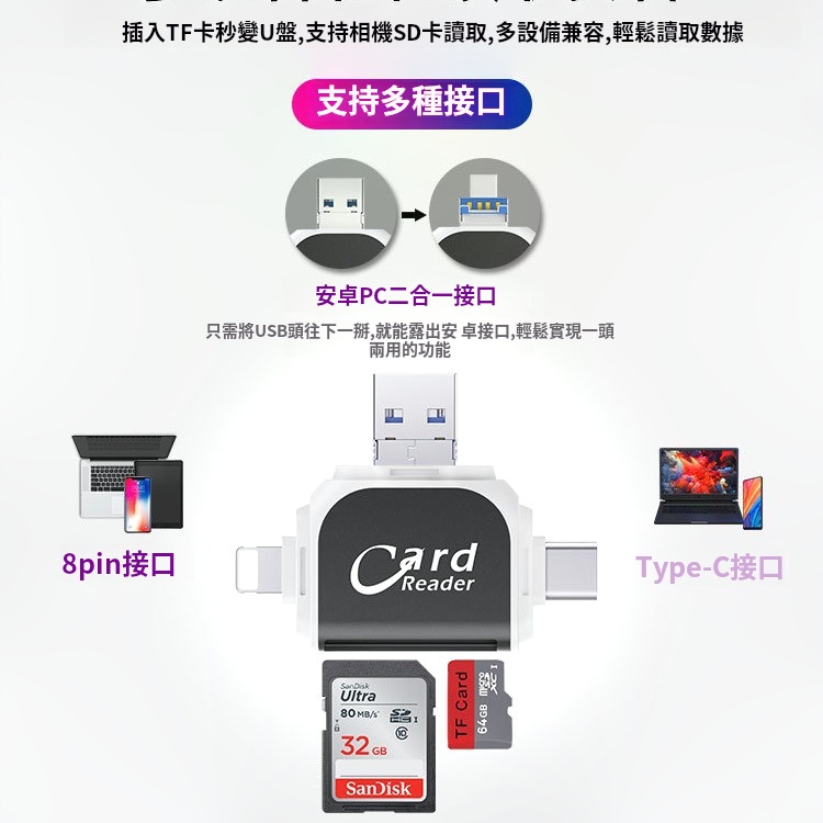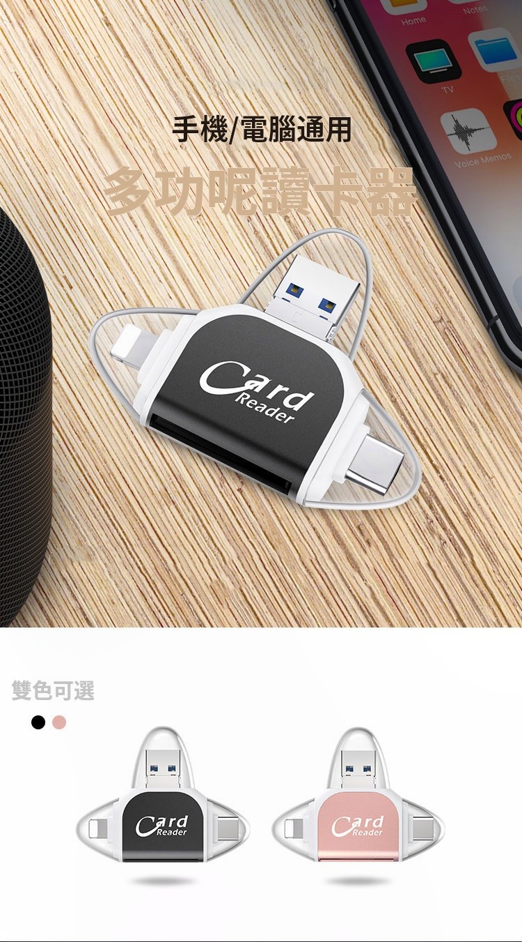 20分鐘前多功能讀卡器適用於蘋果安卓手機 - 【優惠價】四合一多功能讀卡機 一入組 NT$788