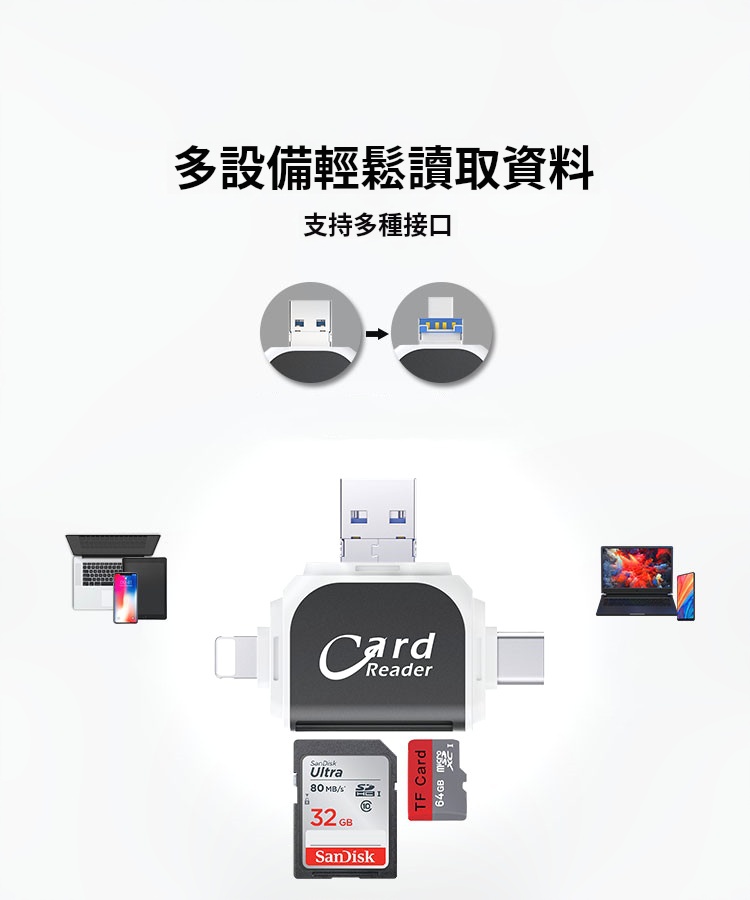 2分鐘前多功能讀卡器適用於蘋果安卓手機 - 【優惠價】四合一多功能讀卡機 一入組 NT$788