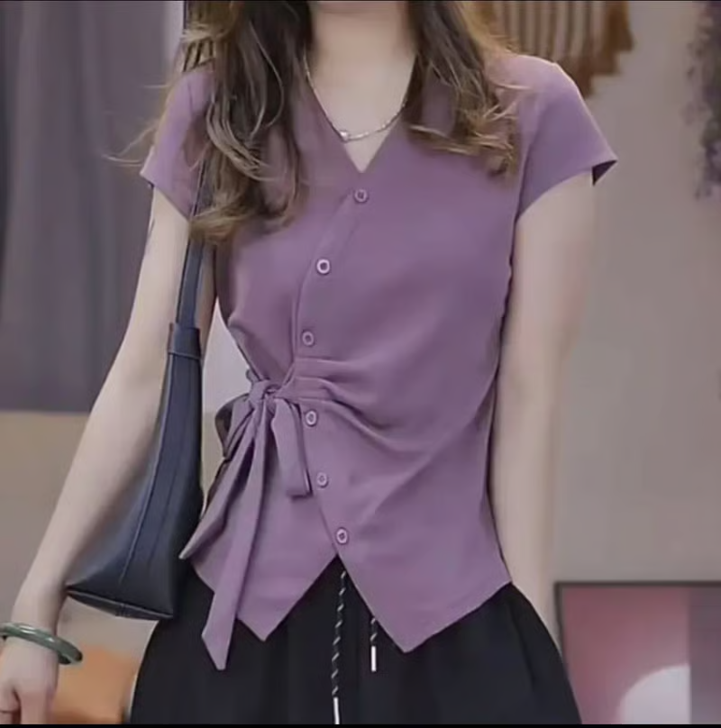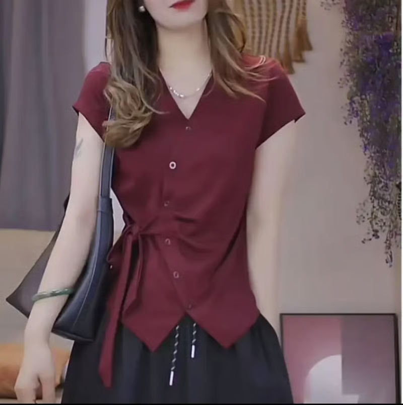 25分鐘前夏季新款重工不規則設計短袖時尚綁帶V領T恤女修身顯瘦上衣女 - 【超值團購】到手3件-NT$1699
