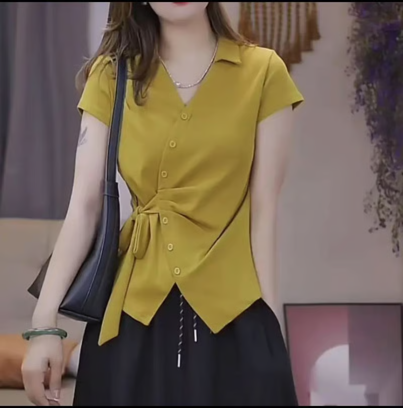 12分鐘前夏季新款重工不規則設計短袖時尚綁帶V領T恤女修身顯瘦上衣女 - 【超值團購】到手3件-NT$1699