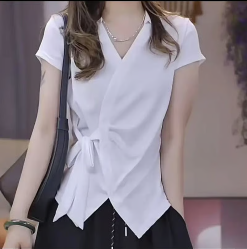 5分鐘前夏季新款重工不規則設計短袖時尚綁帶V領T恤女修身顯瘦上衣女 - 【新品特價】到手1件-NT$999