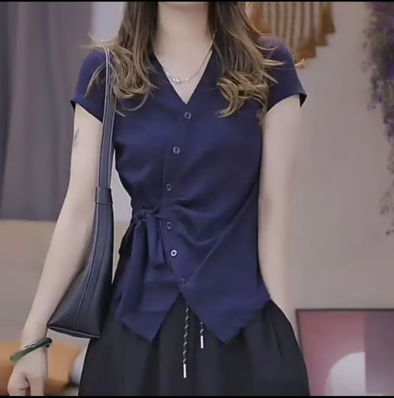 25分鐘前夏季新款重工不規則設計短袖時尚綁帶V領T恤女修身顯瘦上衣女 - 【均價699】到手2件-NT$1399