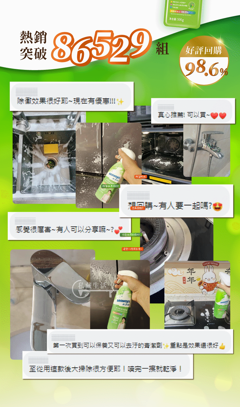 2分鐘前全屋煥然一新日本瘋搶除垢劑【Seaways極效潔垢劑】極效去汙X乾淨透亮 - 極效潔垢劑【6入】再享免運!