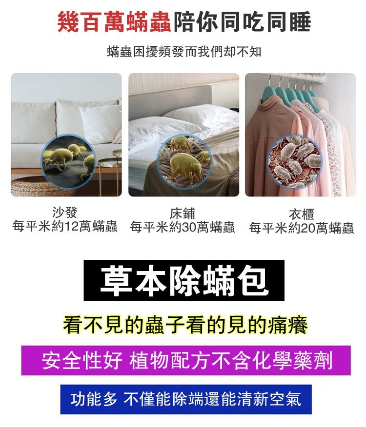 2分鐘前草本除蟎包「春夏季節」蟎蟲細菌容易滋生繁殖快,有了這款除草本除蟎包,在也不用擔心了!! - 「買三送七」十入組NT$1399(均價低至$139/盒)共100小包
